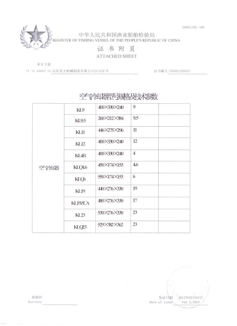 空氣冷卻器-船用產品型式認可證書